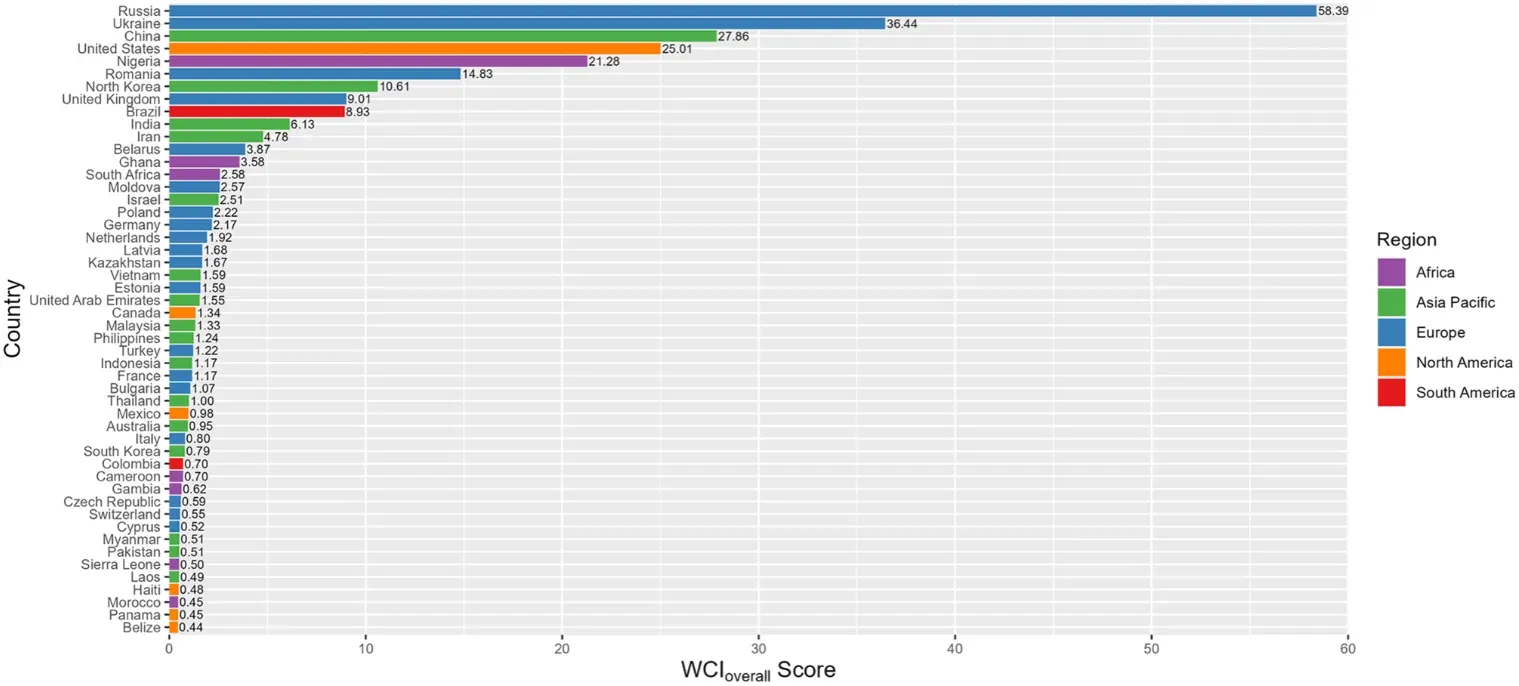Indeks, objavljen u časopisu PLOS ONE, pokazuje da relativno mali broj država predstavlja najveću opasnost od cyber kriminalaca. Rusija se nalazi na vrhu liste, koju slijede Ukrajina, Kina, Sjedinjene Američke Države, Nigerija i Rumunija. Velika Britanija zauzima osmo mjesto.
